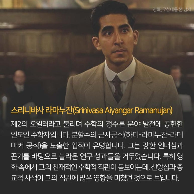 그의 천재성을 알아본 영국 왕립학회의 괴짜 수학자 ‘하디 교수’는 엄격한 학교의 반대를 무릅쓰고 케임브리지 대학으로 ‘라마누잔’을 불러들인다.